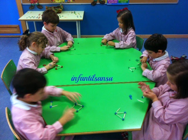 Y hoy hemos formado rombos con los bloques lógicos, con una goma, con palillos, con plastilina... ¡¡Si juntamos dos triángulos hacemos un rombo!!